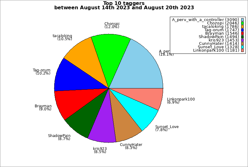 | Top 10 taggers between August 14th 2023 and August 20th 2023 | ||