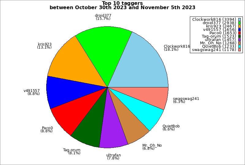 | Top 10 taggers between October 30th 2023 and November 5th 2023 | ||
